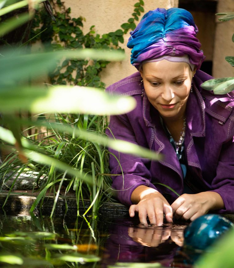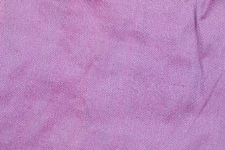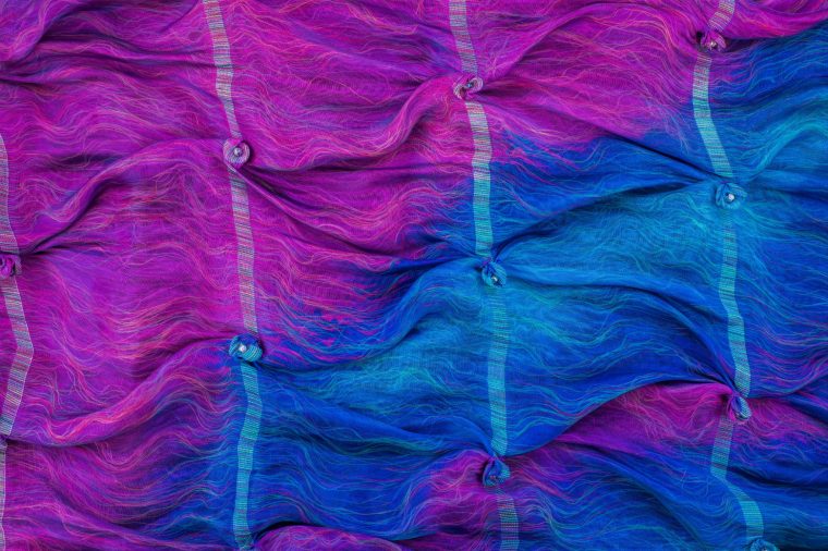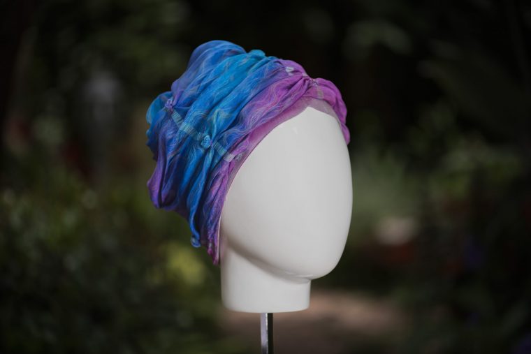 Capelina de entretiempo confeccionada en gasa con flecos y pliegues transversales rematados con nudo y bola simulando una flor. El frontal con raya central y el interior en tafetán ligero de seda color lila tornasolada.