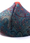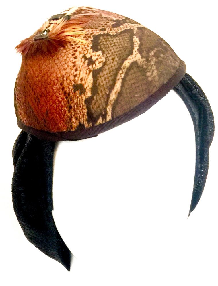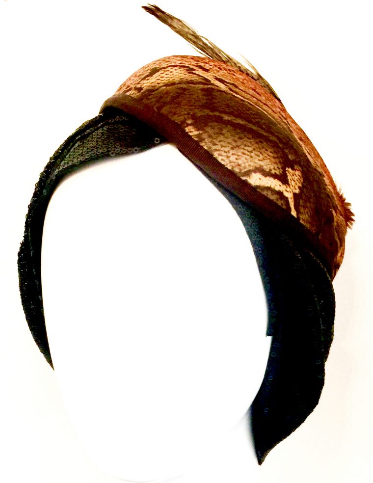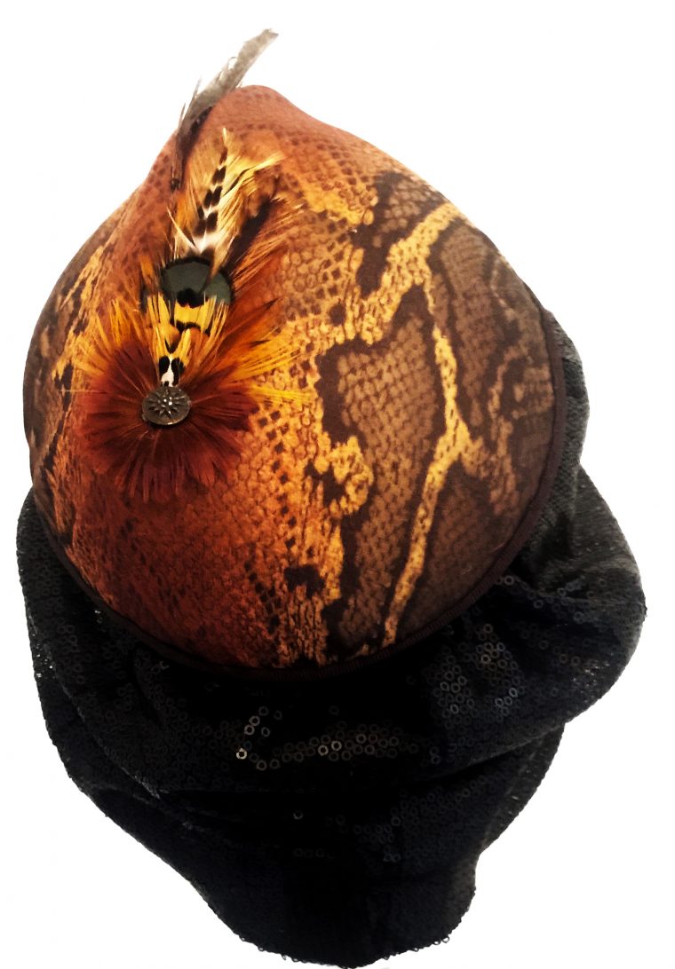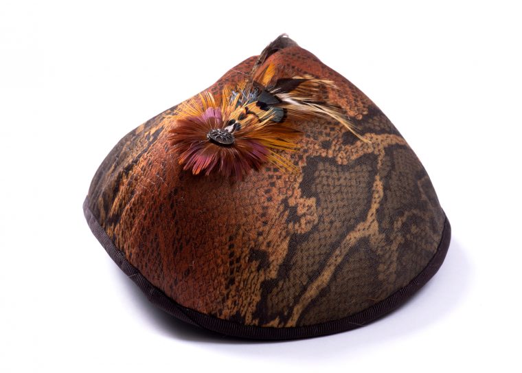 Tocado en horma valley, estructura de buckram guateada y forrada en algodón con estampado floral. Forrado en seda color verde musgo y rematado con cinta grosgrain color calabaza.