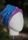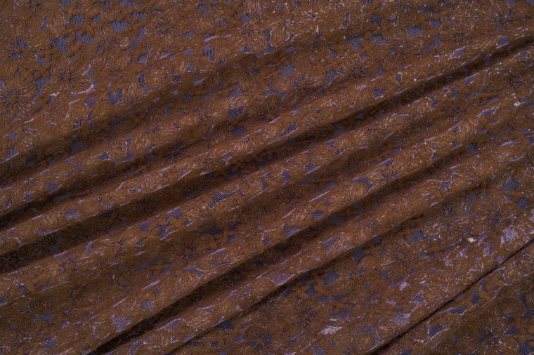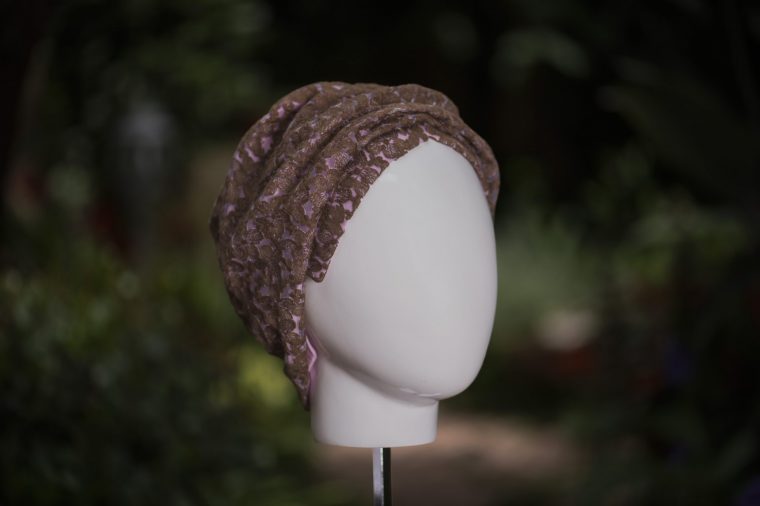 Capelina de entretiempo confeccionada en tul rosa con brocado en algodón color chocolate y el frontal con raya central del mismo tejido. El interior en tafetán ligero de seda color rosa palo.