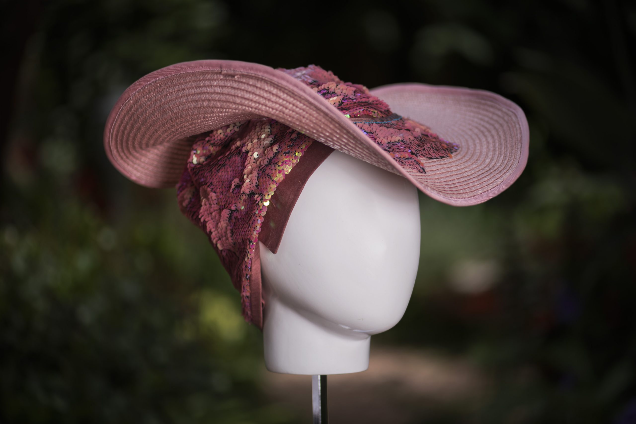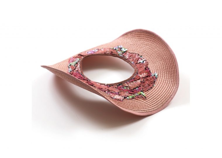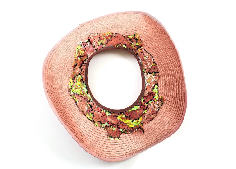 Ala extraíble tipo cowgirl, realizada en trenza concéntrica de rafia color rosa palo, aplicaciones de lentejuelas bicolor y rematada con cinta grosgrain rosa.