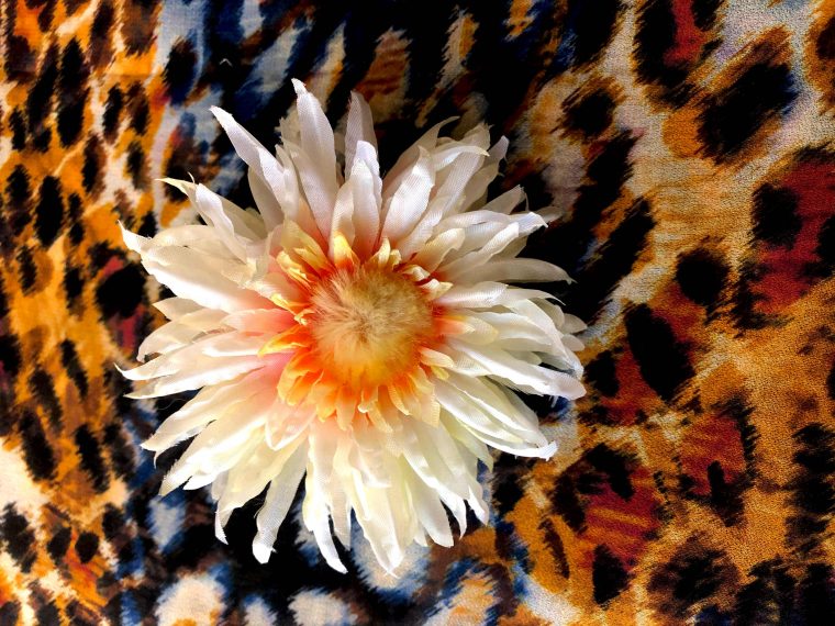 Flor realizada en raso tintado a mano con pistilos de seda peinada.