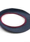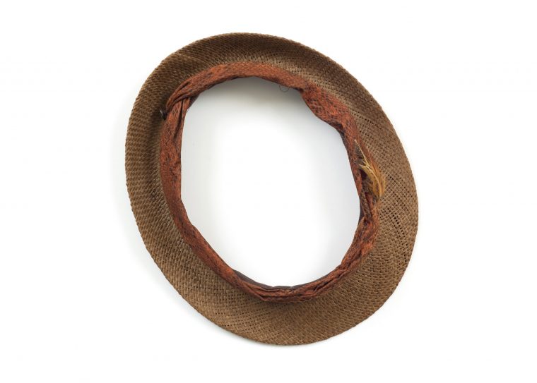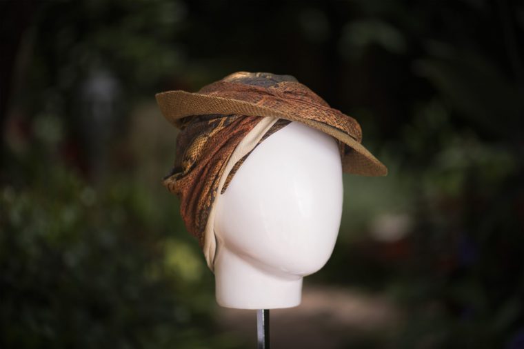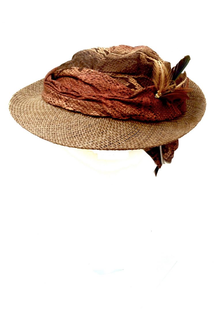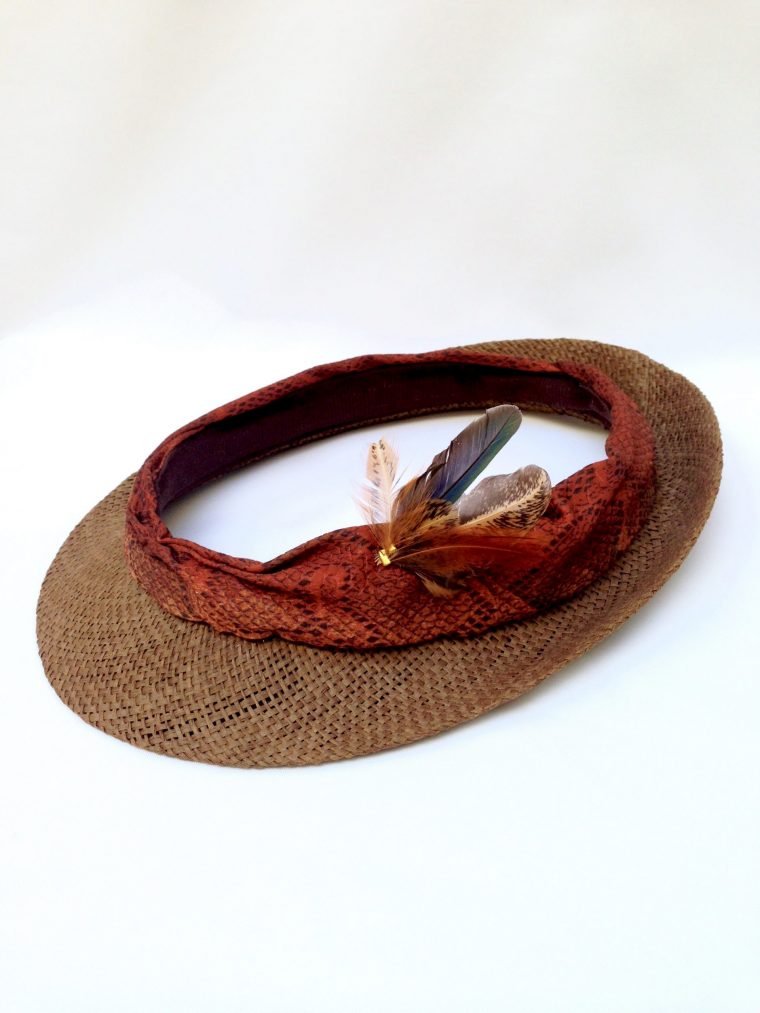 Ala extraíble tipo fedora, realizada en fibras de papel de color avellana con cinta de encaje de punto con estampado reptil y botón metálico.