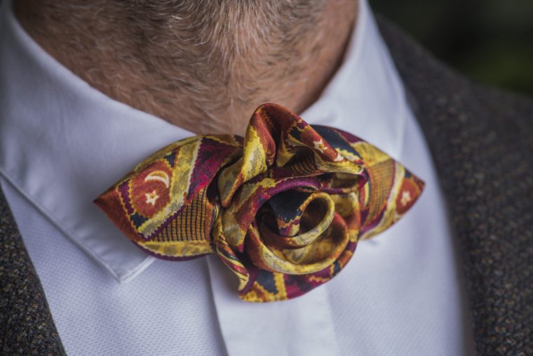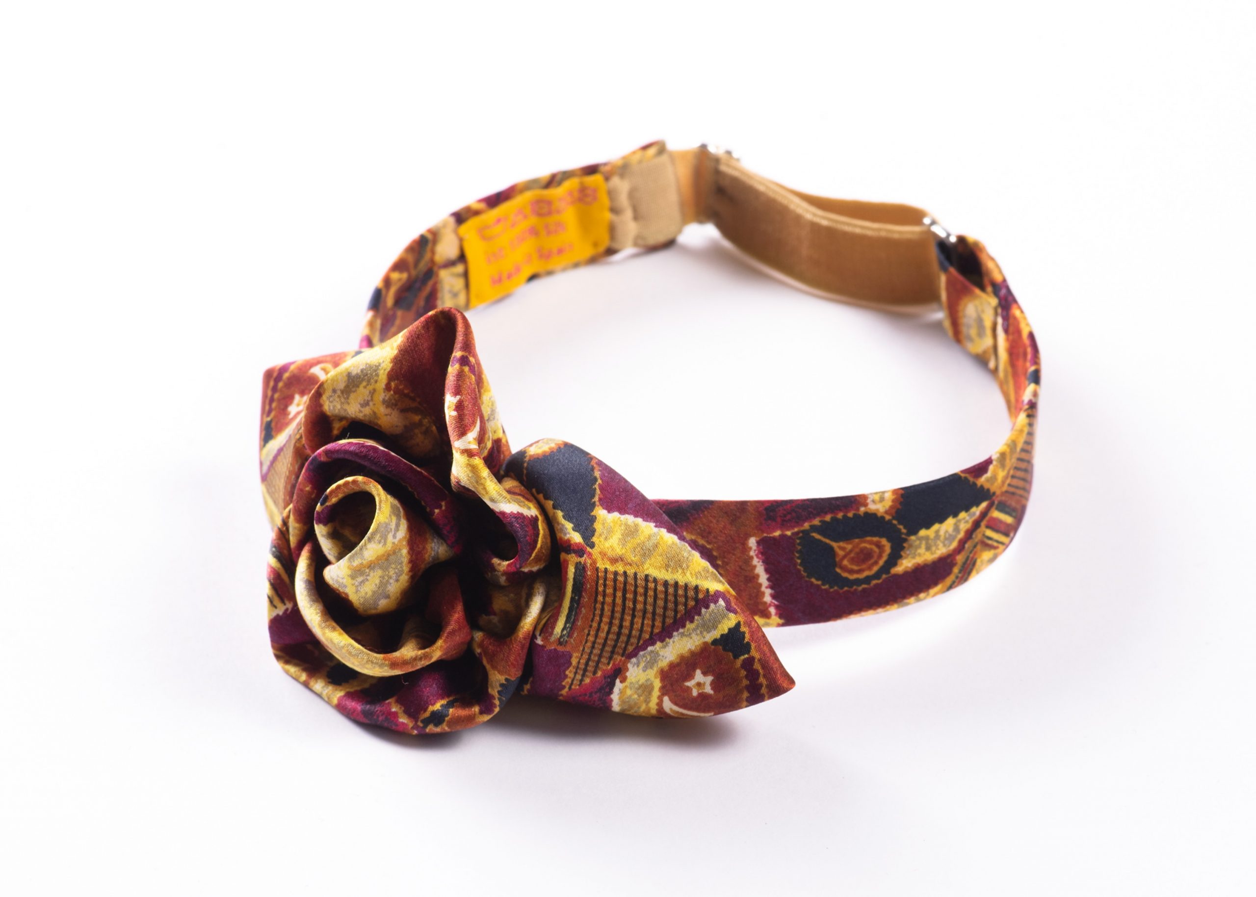 Pajarita en forma de rosa realizada en seda de corbata vintage con tirante de ajuste en terciopelo elástico y pasador de acero inoxidable.