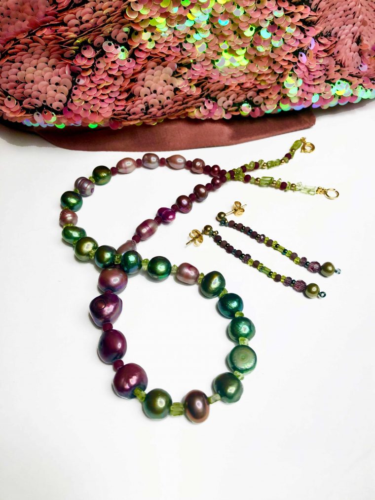 Perlas cultivadas teñidas, Olivino y vidrios.