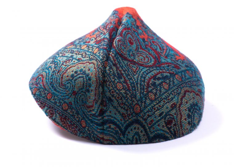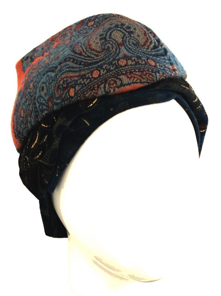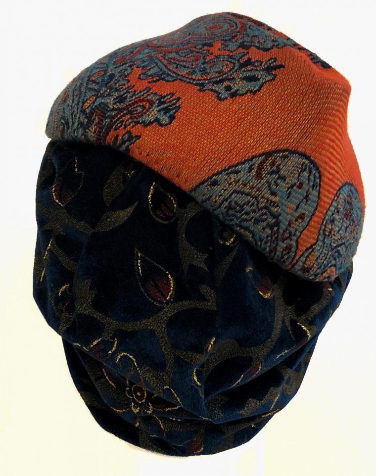 Tocado en horma valley, estructura de buckram guateada y forrada en algodón con estampado floral. Forrado en seda color verde musgo y rematado con cinta grosgrain color calabaza.