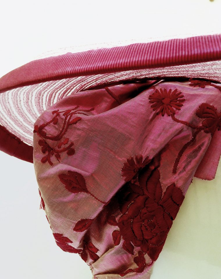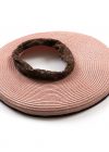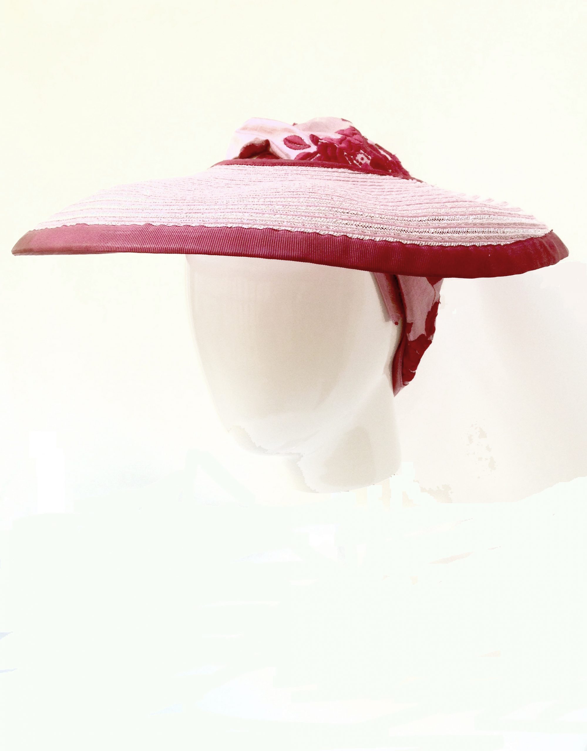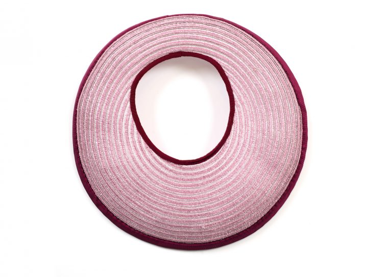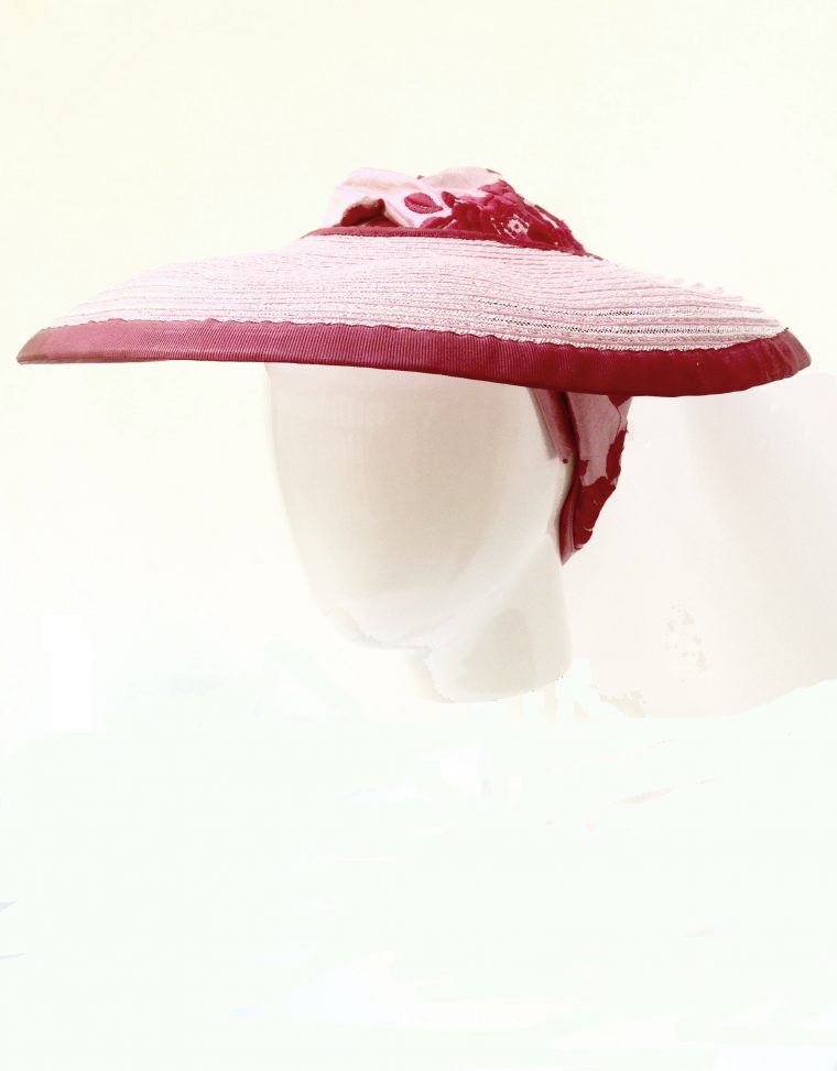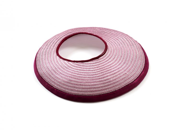 Ala extraíble tipo pamela, realizada en trenza concéntrica calada, en color rosa y plata, rematada con cinta grosgrain color burdeos.