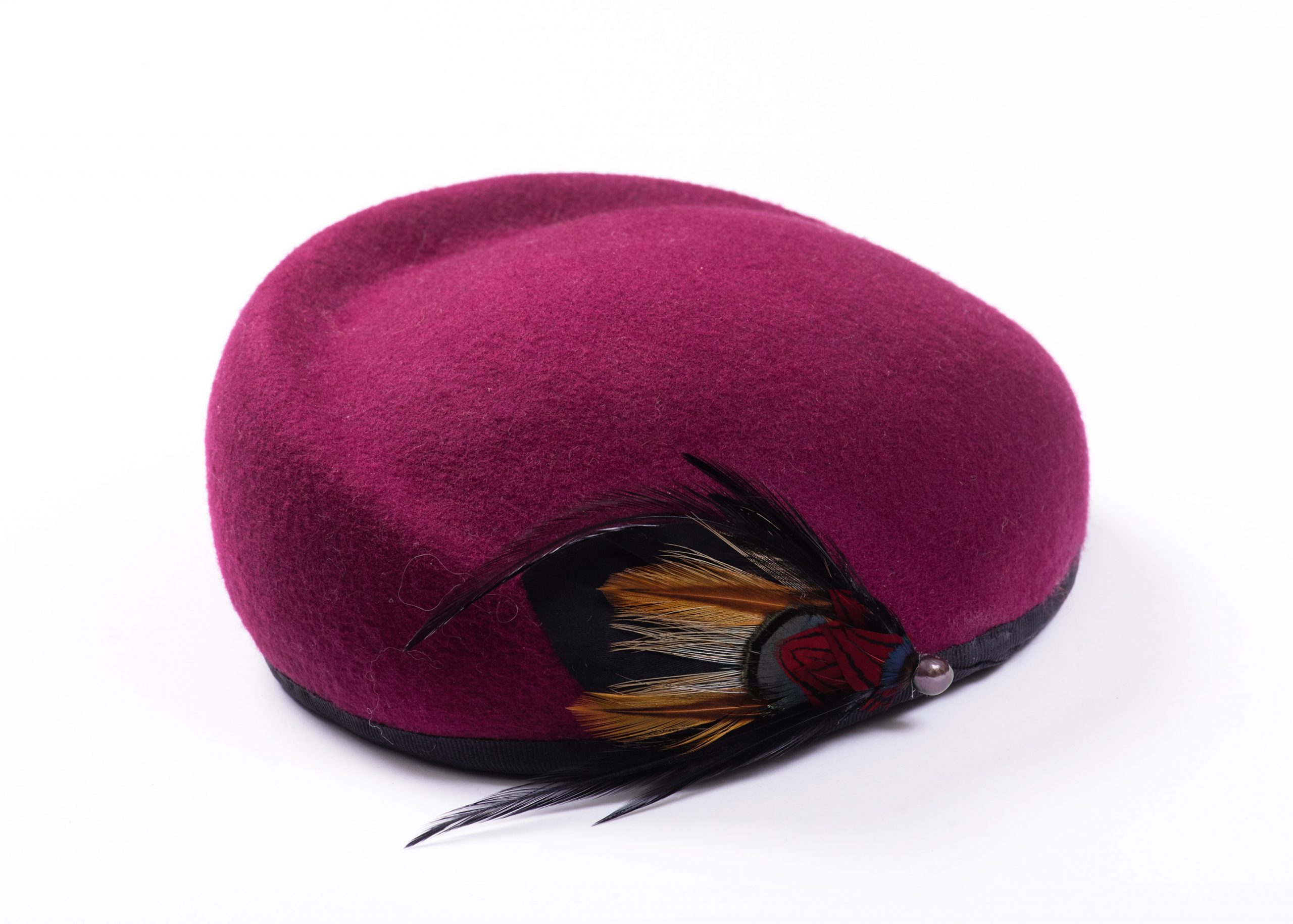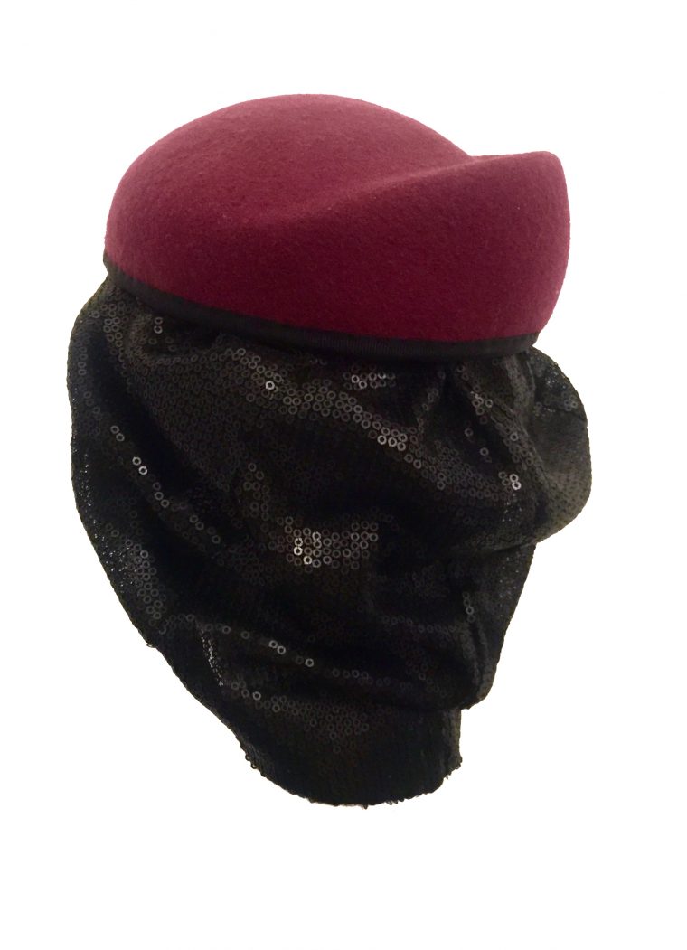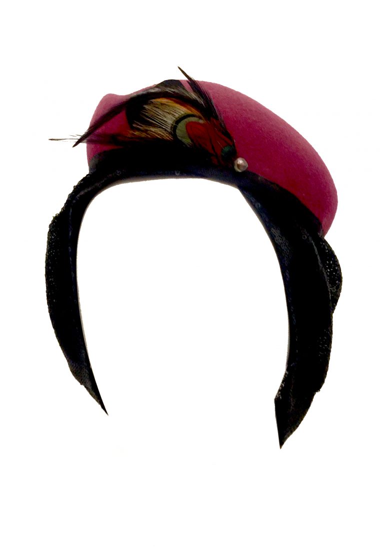 Pillbox en horma SHELL, realizado en fieltro color burdeos rematado con cinta grosgrain color negro, forrado en seda y decorado con broche de plumas y perla cultivada teñida.